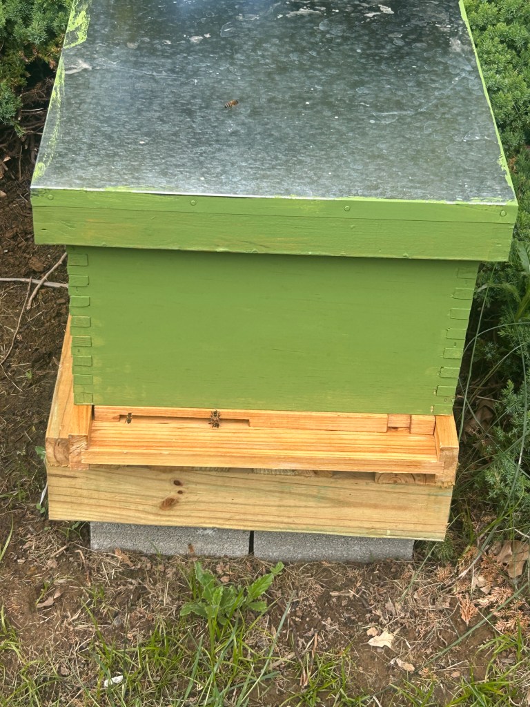 After a few days of nice warm sunny weather, I decided it was time for the move. I waited until after dusk so that most of the bees were back from their day of foraging. I covered the entrance with a piece of cardboard and moved the swarm trap to where I had set up their permanent hive about 15 feet away from where they were previously located. There is a beekeeping “rule” that says you should move a colony no more than 3 feet or no less than 3 miles because they may try to orient to the previous site if the new site is too close or too far to the original. I obviously broke that rule, but I will let you know how it turns out and if there is any truth to it. I set the swarm trap on top of the hive and removed the cardboard from the entrance.