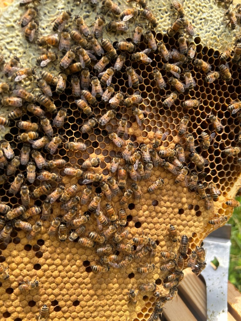 Begin inspecting the hive by removing one frame at a time. Your hive tool will be very helpful to pry the fames apart from each other and the hive. Bees create and use propolis to seal up any spaces in the hive this includes the edges of frames and spaces between them. Replace the frames in the same spot and same direction as they were removed. The bees built the comb in a specific way that works for their colony and we shouldn’t rearrange it unless we have a reason to. During the inspection we are looking for the queen or signs that we have a healthy queen. You don’t have to look at every frame but you do want to see eggs, larva and capped brood. you may see nectar filled cell or capped honey.