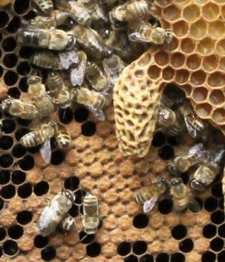 You may see Queen cups, longer cells that hang from the comb. This could indicate the colony is considering swarming or requeening themselves or it could just be to practice building these cups. Swarm cells are usually built along the bottom of the frame and supersede cells are usually built closer to the center of a frame in the comb. Neither of these are always true. Different beekeepers address the cells in different ways. Supersede cells should be left alone because the bees likely have a reason for them, either practice or to replace the current queen. Some beekeepers remove swarm cells to prevent swarming. Others add space to the hive or use this as an indication that it is time to split the hive into two.